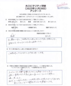 もう何クールも弊社の研修にご参加いただいている先輩からは後輩スタッフに「この内容、実際の現場で使えているから覚えておいたほうがいいよ!」