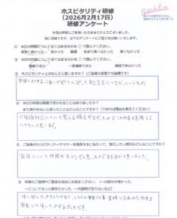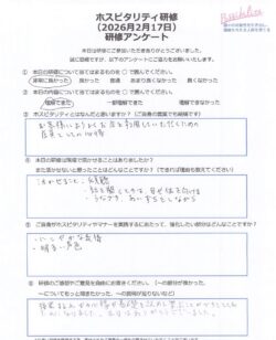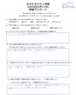 ホスピタリティのポイントの項目ではすぐに実践し、表情や所作などお互いに褒め合う姿は微笑ましかったです。