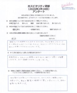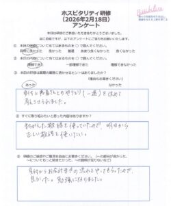 今回はルーティン業務におけるホスピタリティのポイントをお伝えしたり、患者さん心理とホスピタリティの関係についてもワークを行い、より高い応対品質を目指しました。